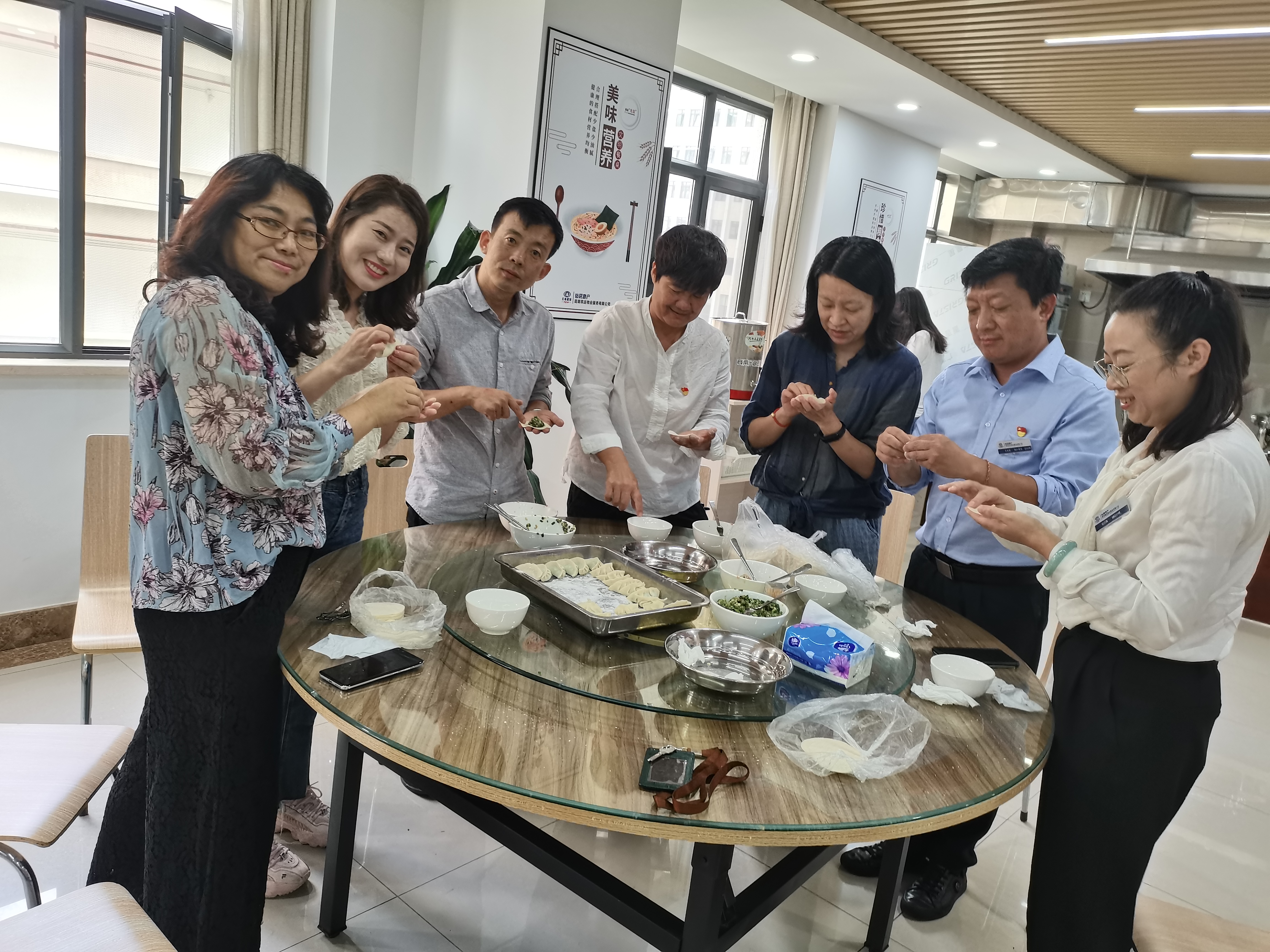 交流結(jié)束后,由筑遠(yuǎn)物業(yè)、通泰公司、和順公司支部聯(lián)合開(kāi)展的包餃子活動(dòng)正式開(kāi)啟。上午11點(diǎn),食堂工作人員已將準(zhǔn)備好的食材和用具擺放整齊,大家捋起衣袖,有的在包,有的在學(xué),用自己拿手的方式包著各式各樣的餃子。過(guò)程中分工協(xié)作,有條不紊,大家一邊包餃子一邊交流工作,一邊談心得,笑語(yǔ)不斷,情緒高漲,臉上寫(xiě)滿(mǎn)了快樂(lè)和幸福。